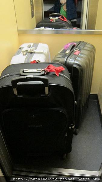 狹窄的電梯,我們就把行李箱們通通推進去,讓他們自己上樓